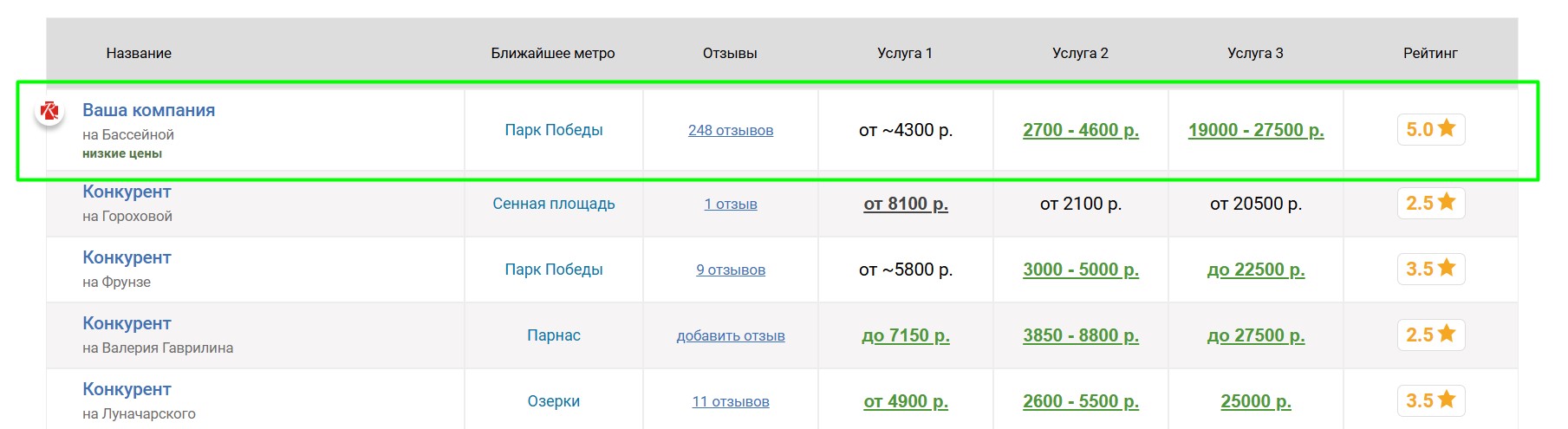 Вокруг продвигаемой таким образом школы выбирается некоторое количество ближайших конкурирующих школ, продвигаемая школа попадёт к ним в таблицу «Сравнение по ценам», которая выглядит следующим образом: